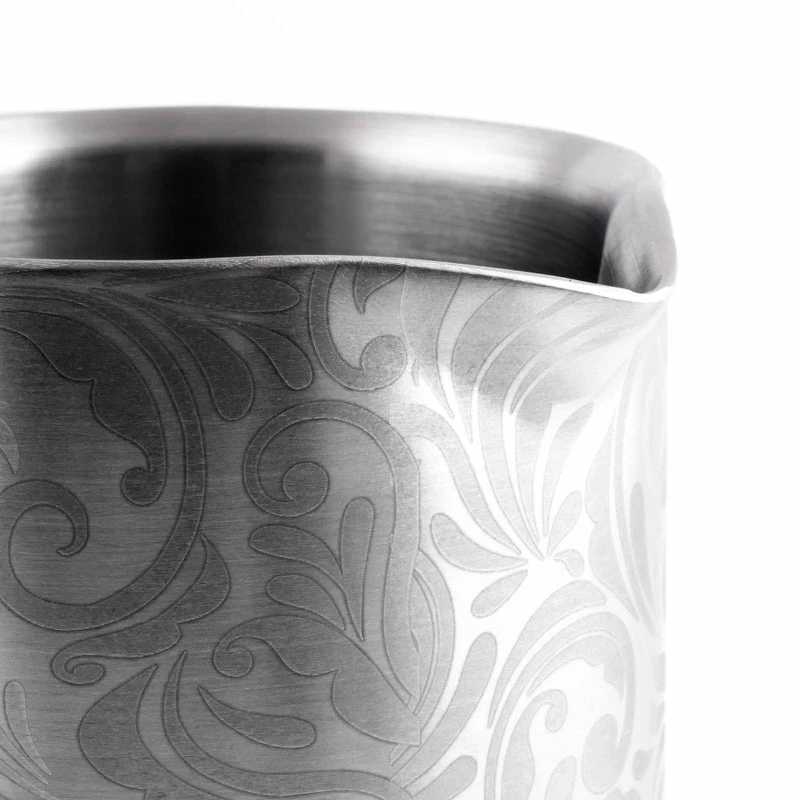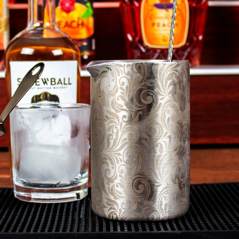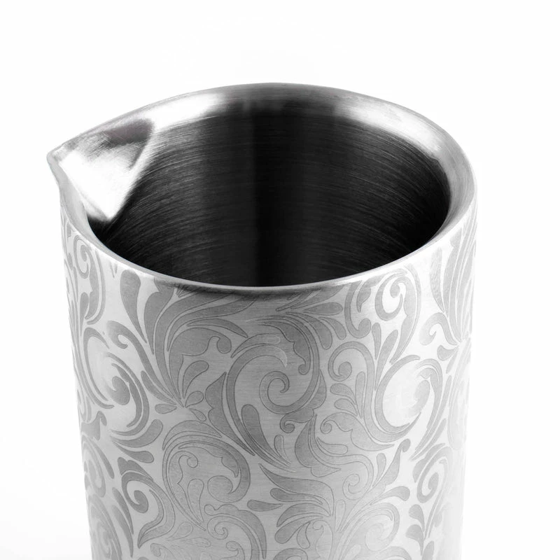 This BarConic® mixing glass is a beautiful piece to have have in your collection of bar tools. It is made of stainless steel and features beautiful etched floral patterns all around the glass. Featuring a spouted rim, this mixing glass allows for a convenient pour. It has a liquid capacity of 18 ounces and a measurement of 5.25″ in height with a rim diameter of 3.5″.