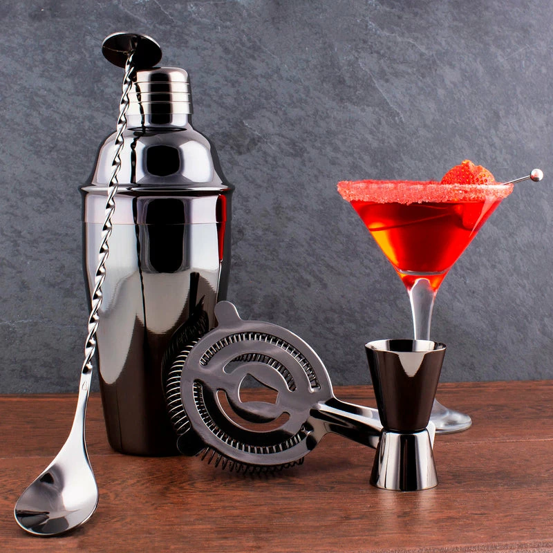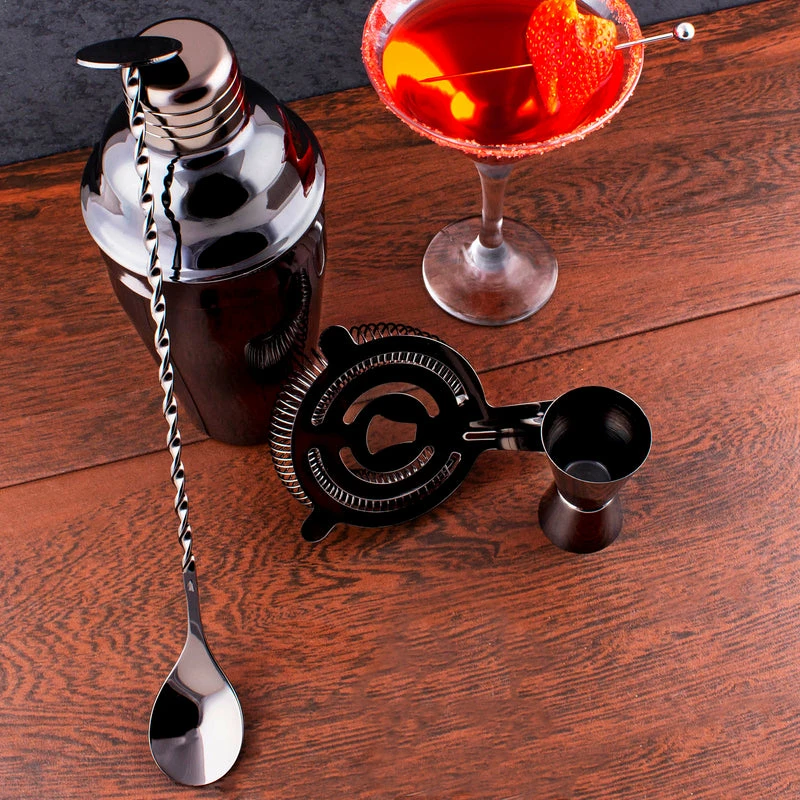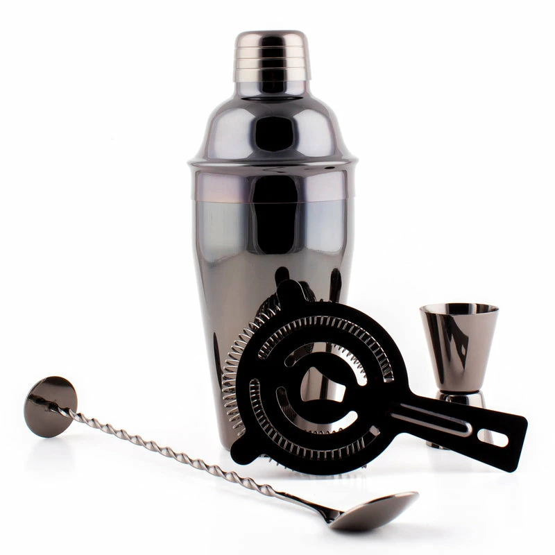 This Gun Metal Barware Set includes everything you need to get started in making cocktails. Complete with a cobbler style shaker, double jigger, hawthorne strainer, and spoon that doubles as a muddler. The metallic dark grey finish creates a unique looking set of bar tools than your usual silver finish. This set is also made of durable stainless steel. This is a item to give as a gift to bartenders or cocktail lovers in your life.