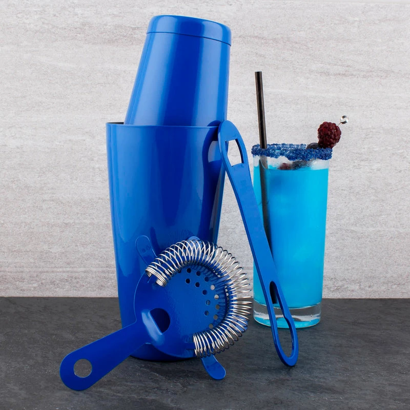 This 4 piece Signal Blue bar set is equipped with everything you need when making cocktails for your guests. Not only can this set get you started, but it also makes the perfect gift for your bartending friends. It is made of durable stainless steel and has a bright reflective color making it stand out in your bar. This set includes a 28 ounce and 18 ounce shaker tin, a 4 prong strainer, and a V-Rod® opener.