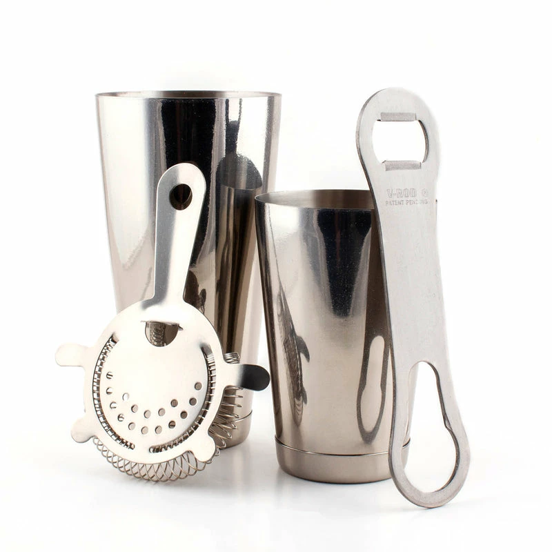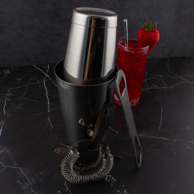 This 4 piece Pink Glitter Bar Set is equipped with everything you need when making cocktails your guests. Not only can this set get you started, but it also makes the perfect gift for your bartending friends. It includes a 28 ounce and 18 ounce shaker tin, a 4 prong strainer, and a V-Rod® opener. It is made of durable stainless steel and has a bright reflective color making it stand out in your bar.