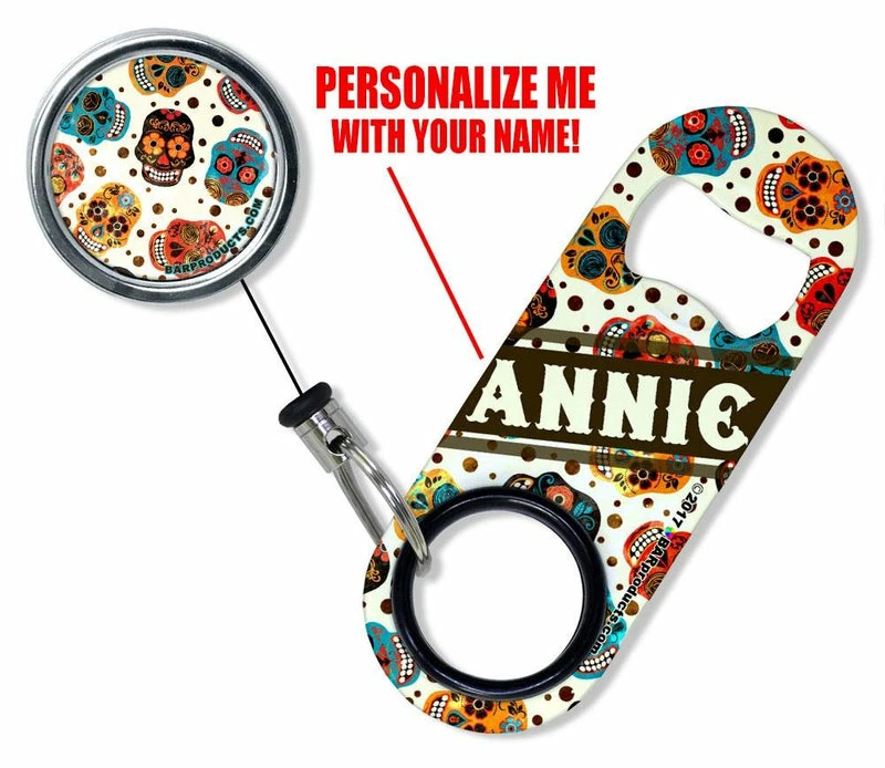 Clip your bottle opener practically anywhere for quick, convenient access… and do it with style! Showcasing a full color Mexican Skulls design, we have tastefully decorated our trendy mini bottle opener to match this quality retractable reel. Clip it to your belt, pants, pocket, purse or anywhere else you can think it would come in useful.