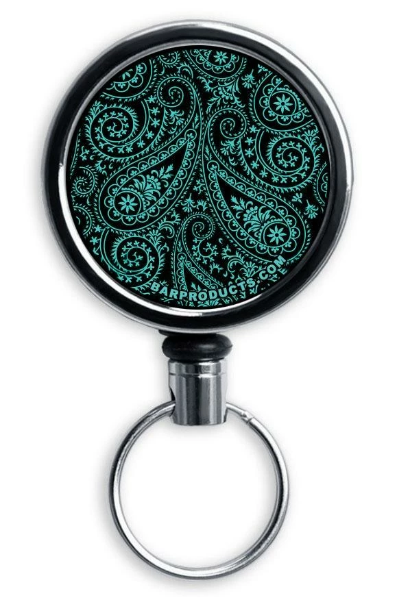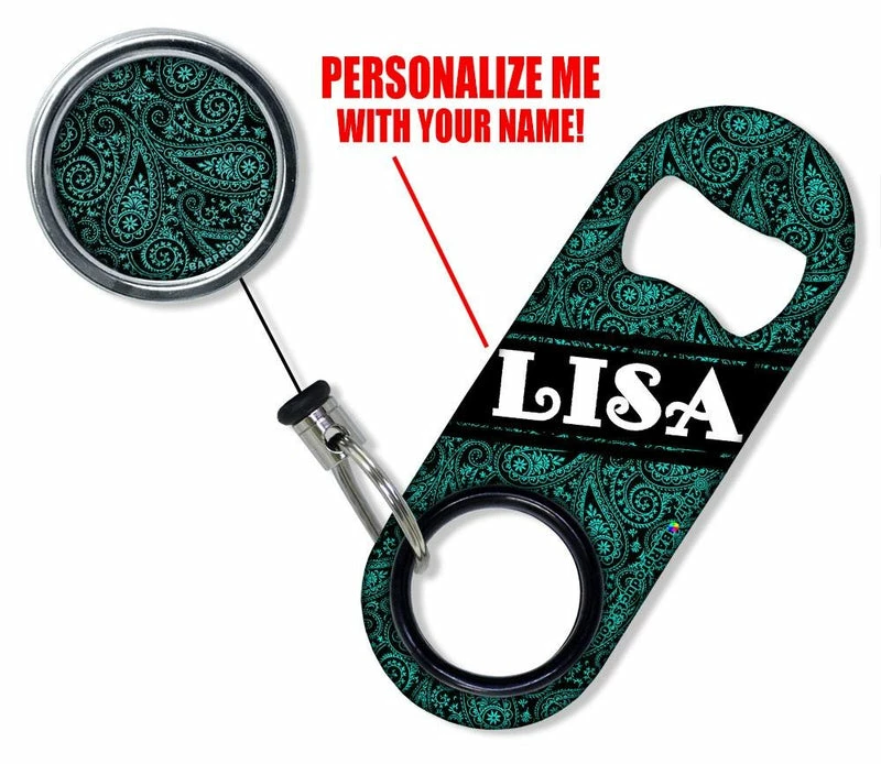 Clip your bottle opener practically anywhere for quick, convenient access… and do it with style! Showcasing a full color Teal Paisley design, we have tastefully decorated our trendy mini bottle opener to match this quality retractable reel. Clip it to your belt, pants, pocket, purse or anywhere else you can think it would come in useful.