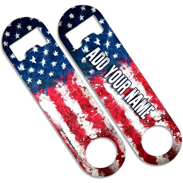 If you are someone that is a fan of our mini style speed openers then you are sure to love this Skinny Mini Bottle Opener! Choose from a large selection of fun coloful designs, such as this “Grunge US Flag” design template that can be customized with your very own name! Simply type in your text and our design team will do the rest!