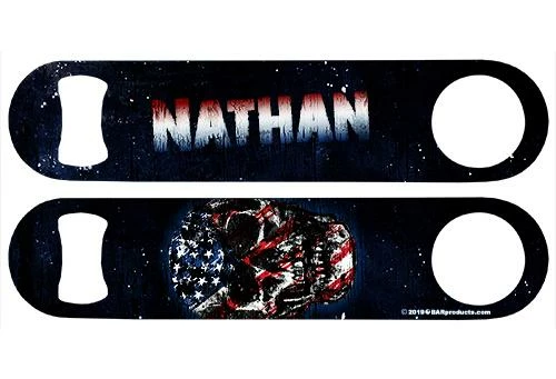 Show your love for the greatest country on Earth and maintain your edge as well with this customizable attractive grunge USA bottle opener. The red, white, and blue are displayed across a gnarly skull graphic, and you can add your name or any other text to the other side! Simply type in the text and we do the rest! Add your name, business or anything you wish for a completely personalized bar key. Our printed bottle openers showcase vibrant color imprints wrapping a high quality stainless steel professional bottle opener. These bottle openers also make for great gift ideas.