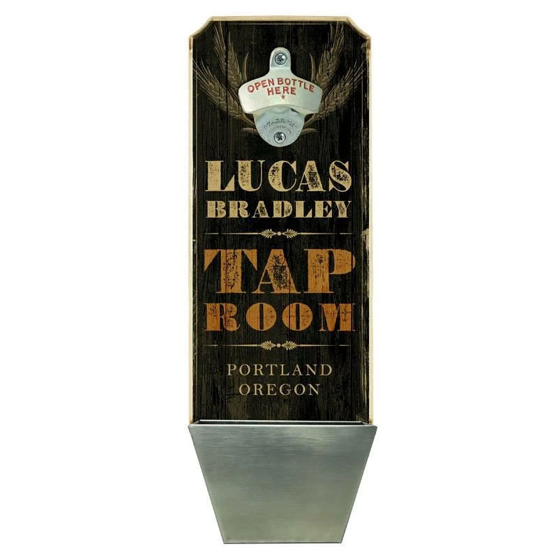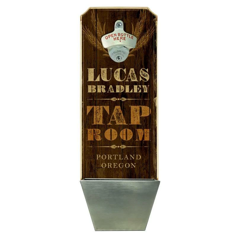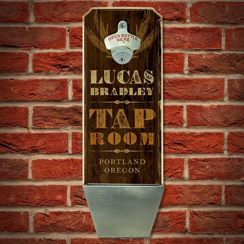 Home and bar decor can certainly set the tone for your guests. They can also make for great conversation pieces! This Vintage Style, Rustic “Tap Room” themed wall mounted bottle opener and cap catcher will do just that. The best part is that it is completely customizable. All you need to do is simply type in the required fields with your text and we will custom design this very cool, distressed wooden bottle opener for you. Think about how excited your friends and family will be when they receive this gift personalized with their name or favorite phrase.