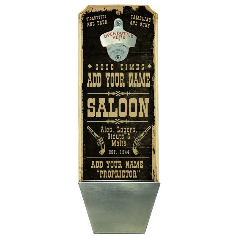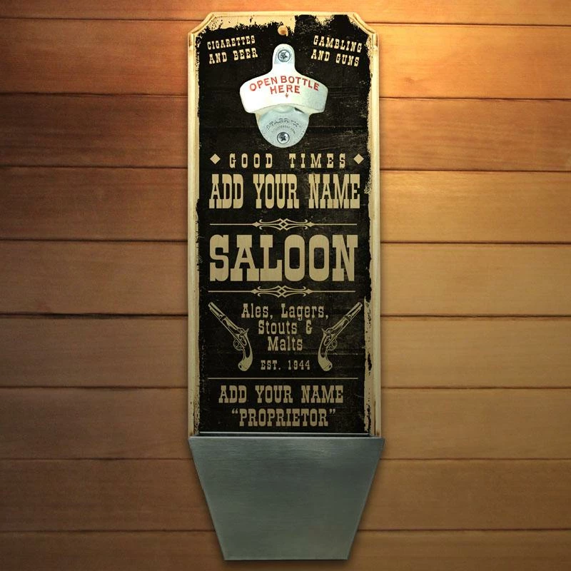 Home and bar decor can certainly set the tone for your guests. They can also make for great conversation pieces! This Vintage Style, Old West “Saloon” themed wall mounted bottle opener and cap catcher will do just that. The best part is that it is completely customizable. All you need to do is simply type in the required fields with your text and we will custom design this very cool, distressed wooden bottle opener for you. Think about how excited your friends and family will be when they receive this gift personalized with their name or favorite phrase.