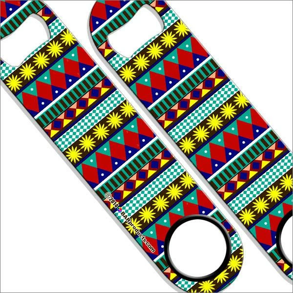Not only are Geometric Aztec designs trendy, but they look beautifully eye catching when decorating our popular “Speed” Bottle Openers. This version (2) design offers a fun and complimenting collection of vibrant colors, red, blue, yellow, green and brown.