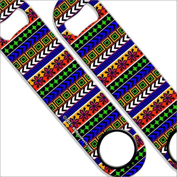 Not only are Geometric Aztec designs trendy, but they look beautifully eye catching when decorating our popular “Speed” Bottle Openers. This version (4) design offers a fun and complimenting collection of vibrant colors, blue, green, black, white, orange and red.