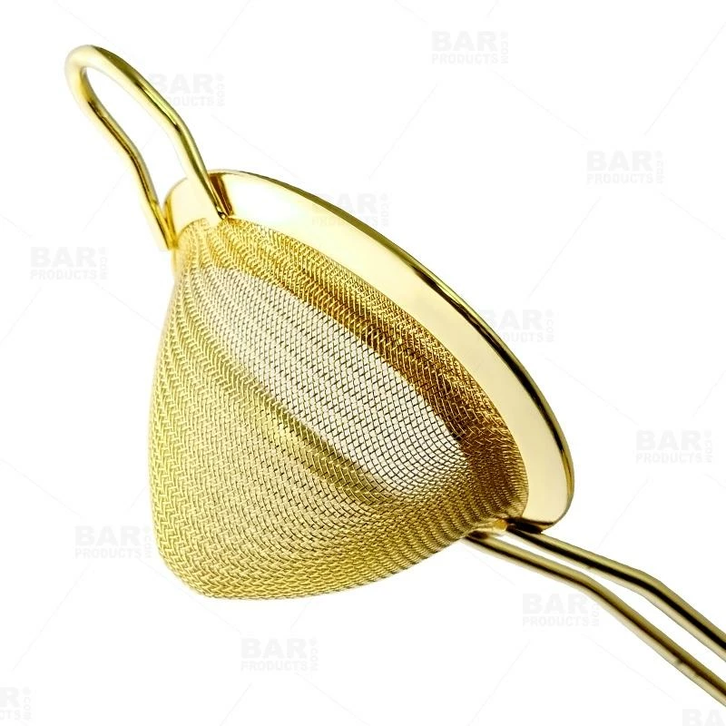This Fine Mesh Gold Cocktail Strainer is beautifully crafted to keep your cocktails fragment free. It is a must have tool for all master mixologists and bartenders. Pour your ingredients into your cocktail without adding pulp residue to your drink. Your masterfully creative cocktail is at the tip of your fingers when using this elegant bar tool.