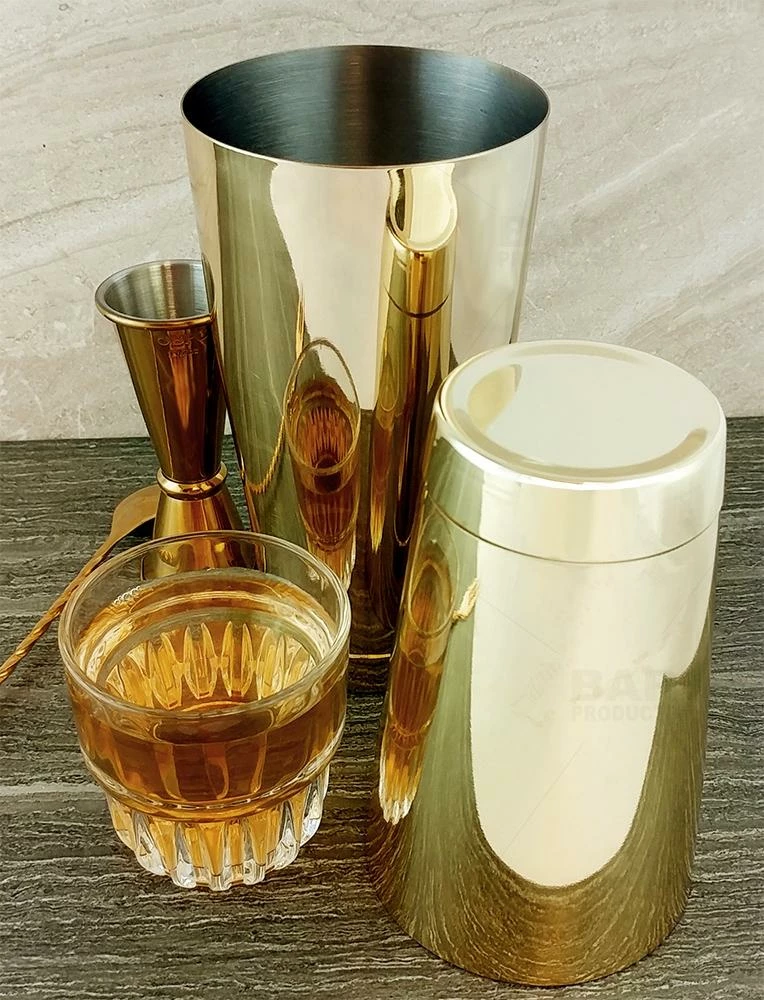 These gorgeous cocktail shakers are a set of a 28 ounce and an 18 ounce shaker. The 28 ounce shaker stands approximately 7” tall while the 18 ounce shaker stands 5.25” tall. This gold plated set is perfectly designed for a well sealed shaking capacity and constructed to create a supreme environment for reaching the conclusive chill to your cocktail. If you prefer to add style and class to your mixology skills, then these precisely polished shakers are a perfect add to your bar tool lineup.