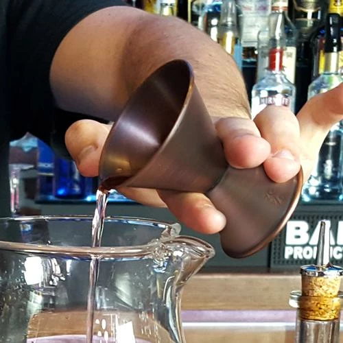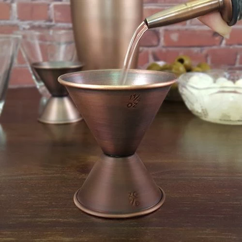 Every bar, restaurant or cocktail friendly home looking to serve high quality precise cocktails needs our BarConic® Antique Finish Double Sided Jiggers. They have been specifically designed to help you maintain reliable pour amounts while also achieving consistent accuracy. Let your patrons know that they are guaranteed premium quality drinks and dependable service. Follow cocktail recipes effortlessly by using a double sided jigger to measure out intended quantities. Easy to clean and simple to use, this bartending utensil is perfect for effective portion control. An essential bartending tool needed in every bartender’s arsenal, a double sided jigger lets you achieve the perfect liquor to mixer balance. This barware tool is a necessity for crafting perfectly balanced cocktails, and with one side measuring .75 ounces, and other side able to measure 1.25 ounces, you’re assured a diverse and useful product. Measure out portions on one side, then flip it over and use a completely different measurement without needing to grab a second measuring utensil. The antique copper finish gives this jigger a classic look that makes this piece a stylish addition to any barware collection. A necessary bartending tool in any bar or restaurant, our BarConic® Antique Finish Double Sided Jigger is the perfect measure of style.