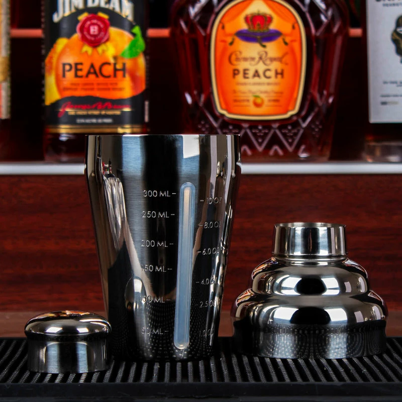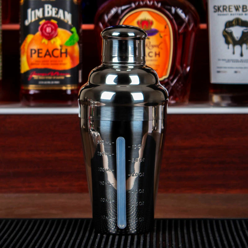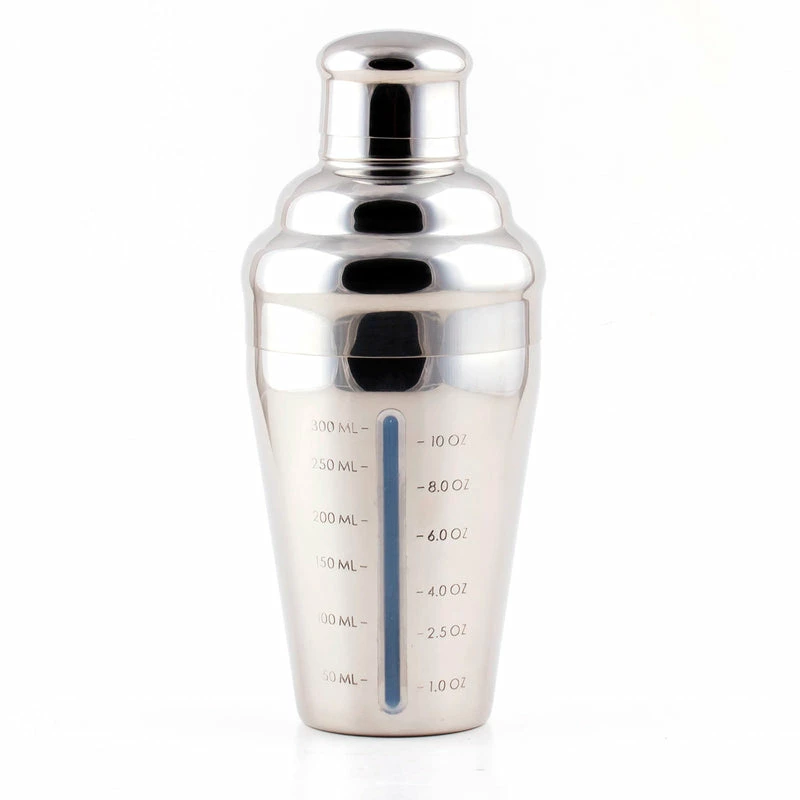 This shaker gives a simplistic look with a truly unique feature. It is made of durable stainless steel and has a highly reflective surface. It has a very unique feature is that it allows you to have a glimpse of the inside of the shaker to make sure you measure out ingredients in the correct amounts. It has an overall liquid capacity of 16 ounces and measures 8.25″ tall with a rim diameter of 3.25″. The measurement line ranges from 1 ounce to 10 ounces.