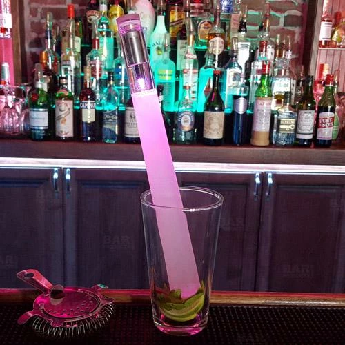 The BarConic® Clear Acrylic Muddler with LED lights is the perfect way to “light up the night” of a dark bar or nightclub! This large acrylic muddler is a true showpiece- lighting up and strobing eight different colors when used. The smart design has the muddler light up when held upright and in use and automatically turns off when lying flat. The heavy muddler measures 30 cm (or 12″) and weighs 9 oz, making for a large showpiece in any setting. The clear acrylic is frosted and includes a tenderizer head for muddling fruit or mint.
