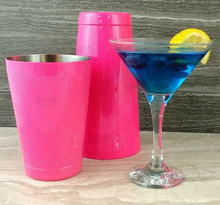 Constructed from high quality stainless steel material, this unique Pink Glitter coating showcases a fun edge to your bartending ammo. The 18 ounce Neon Pink Glitter cocktail shaker is also available with other matching bar tools such as cocktail strainers, various sized shaker tins and bottle openers! All pink glitter products have real glitter flakes right in the coating that any girl will love to show off!