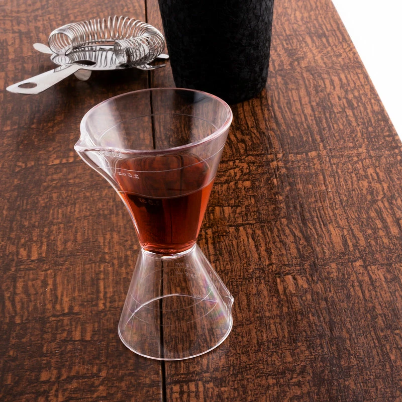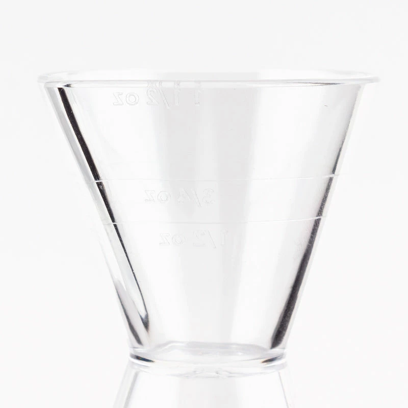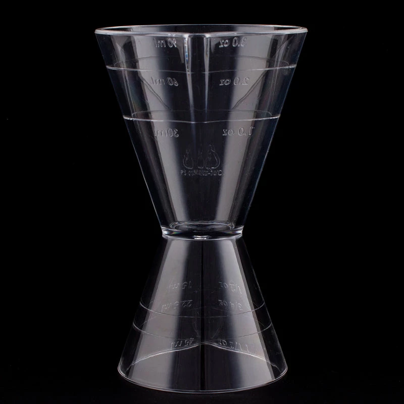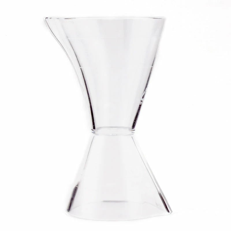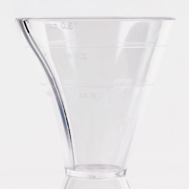 All bartenders know that accurate liquor measurements are critical in maintaining a consistently delicious cocktail. This Jigger is made of clear durable plastic that includes measuring lines to help you get an accurate pour. It even has a spout design on both ends to make poring less messy. This jigger is 4.25 inches in height and is very lightweight. The larger side holds up to 3oz of liquid and the smaller side holds up to 1 1/2oz of liquid.