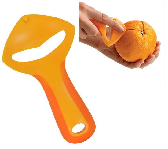 Take a slice out of the orange peeling process with our handy new orange peeler. Made of high impact plastic, this peeler features a cutting edge to make quick work of slicing through rind and a gapped cupping edge to grip the peel and pull back the rind to expose the fruit within.