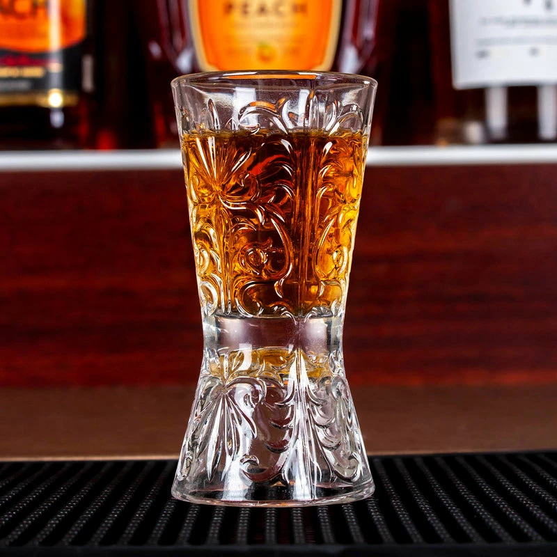 The elegant glass cocktail jigger is a piece of modern barware with a youthful style and tattoo aesthetic. It has a liquid capacity of 2 ounces and stands 4″ tall with a rim diameter of 1.75″. Made in Italy from lead-free eco-crystal, this glass is dishwasher safe, break/chip resistant, and has exceptional lasting brilliance.