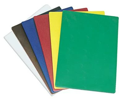 These Cutting Boards are color-coded for safer food handling. They have a quality non-porous surface that will not stain, absorb juices, bacteria or odor. These non-skid surfaces hide knife marks and are non-dulling. Dishwasher safe.