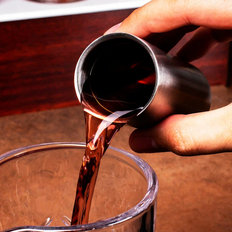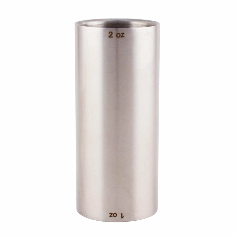 This cocktail jigger is an elegant tool to have in your professional or home bar. It features a double wall construction keeping liquids cold and hot longer. It is made of durable, high quality stainless steel and measures 4″ tall.ย ย This tool also features etched measuring marks that are permanently engraved to prevent the numbers from wearing off. It has 1 ounce and 2 ounce measurements.