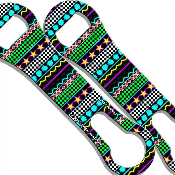 Geometric Aztec designs are not only trendy, but look extremely eye-catching when decorating our V-Rod Bottle Openers. This version (5) offers an oddly complimenting collection of vibrant neon colors, black, green, pink, white, aqua and yellow.