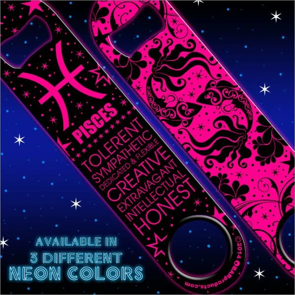 What’s your sign and what does it say about you? We have created a line of NEON Zodiac Sign Speed Bottle Openers you are sure to love. Each of the 12 designs are available on 3 different colored neon openers… Green, Yellow and Pink. They feature all symbols relevant to your astrological birth sign, as well as your characteristics. These bottle openers glow vibrantly under black lighting for the added “space-like” effect.