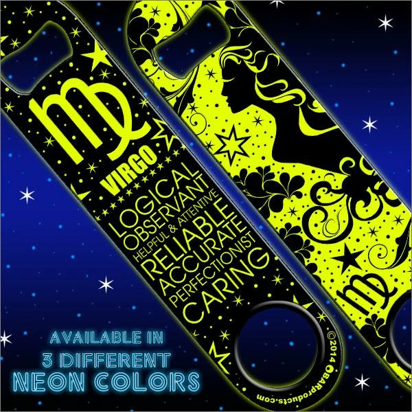 What’s your sign and what does it say about you? We have created a line of NEON Zodiac Sign Speed Bottle Openers you are sure to love. Each of the 12 designs are available on 3 different colored neon openers… Green, Yellow and Pink. They feature all symbols relevant to your astrological birth sign, as well as your characteristics. These bottle openers glow vibrantly under black lighting for the added “space-like” effect.