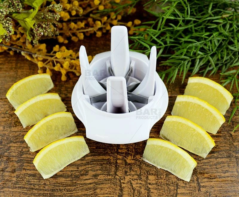 You will be absolutely impressed with the convenience and ease of this perfect slice citrus wedger. Slice up 8 equal pieces of lemons or limes all at once, with one simple press. The sharp stainless steel blades will cut through your citrus fruits like butter, leaving the juices undisturbed and with a clean cut. Simply cut off the ends of your fruit and place into the base of the wedger. Place the blade over the plastic rods and apply an even pressure. In seconds you will have 8 perfectly sized lemon / lime pieces to add to cocktail garnishes as well as signature dishes. This wedger is also compact and easily stores in drawers or cabinets.