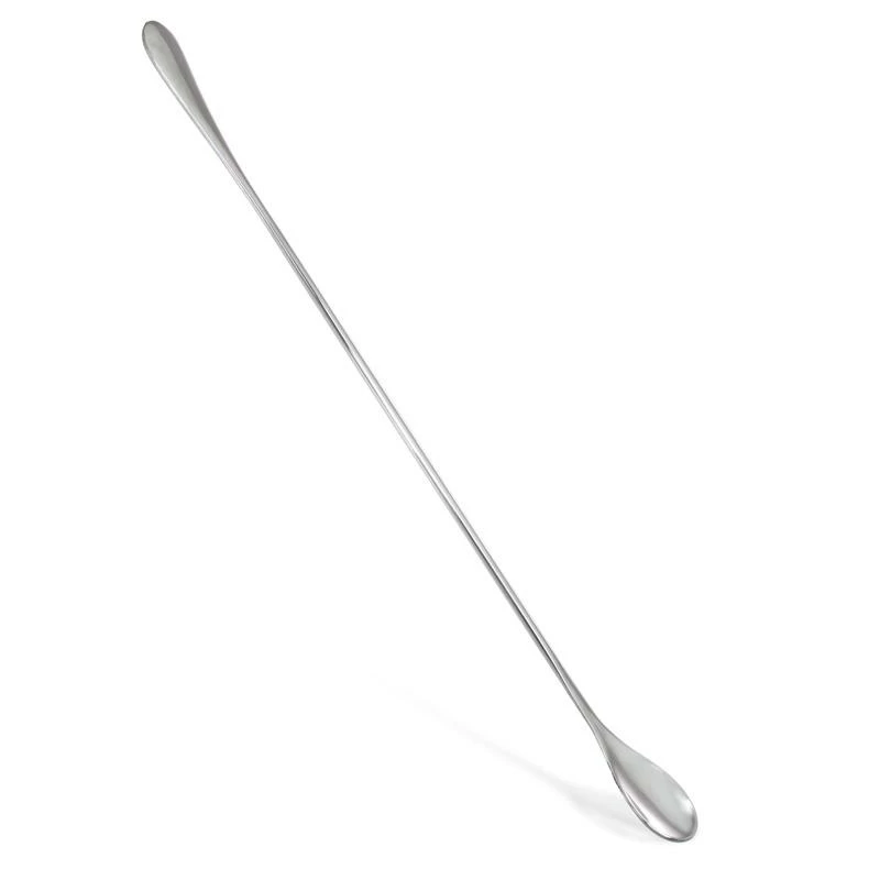 This stainless steel stirring spoon is an ideal way to stir your cocktails and evenly distribute sugar, fruit, and other additions to your drink. The long handle keeps your fingers dry as you stir and the curved part of the spoon is the essential section of the spoon used for mixing. This bar spoon is constructed from solid stainless steel and features a polished finish that complements other various barware and drinking glasses.