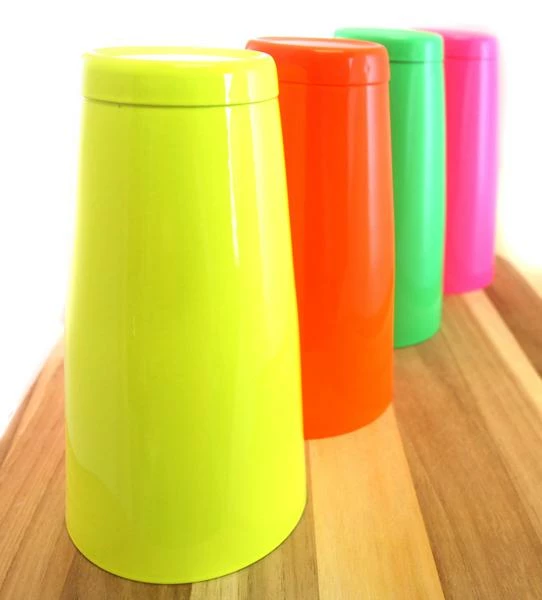 Also available in 16oz cheaters tins for matching, these 28oz stainless steel weighted-bottom shakers are available in bright, black light reacting neon colors, making them bar accessories that are sure to stand out in your collection of tools, or add a bit of flair to your flair bartending.<br /><br />Deciding on the ideal shaker is purely subjective, and you can become proficient with any type you choose. If your main concern is clean ease of operation, a three-piece shaker may suit you. For working mixers who are looking for quickness, a two piece system of capping a small shaker or mixing glass is common, as is preferring instead a single tin for mixing and a wire strainer to separate the ice. Two piece shakers are often sold as a set, and for many look is a large consideration. If you’re looking for a little color and comfortable hold, you may want to try the Vinylworks shaker. Choosing metal or plastic is a factor when budgets and show of both pros and home bar enthusiasts are key.<br/><p><strong>These shakers meet our “Flair Shaker” standards, which require an opening diameter of 91mm-92mm.