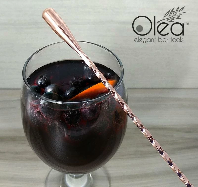 This bar spoon measures 40 centimeters from the teardrop shaped weighted tip, and then twists down the handle (for ultimate control and grip) to the spoon head. The weighted tip offers an amazing control element when in use, allowing the momentum to aid you in the stirring process. Bar spoons are used in many modern mixology recipes. They are commonly used to stir delicate spirits, being careful not to water them down by vigorously shaking and preserving the robust flavors. Bar Spoons also act as the perfect layering tool. If style and class are things you like to incorporate into your mixology skills, then this exquisite Copper plated bar spoon is perfect to add to your bar tool lineup. Not Dishwasher Safe.