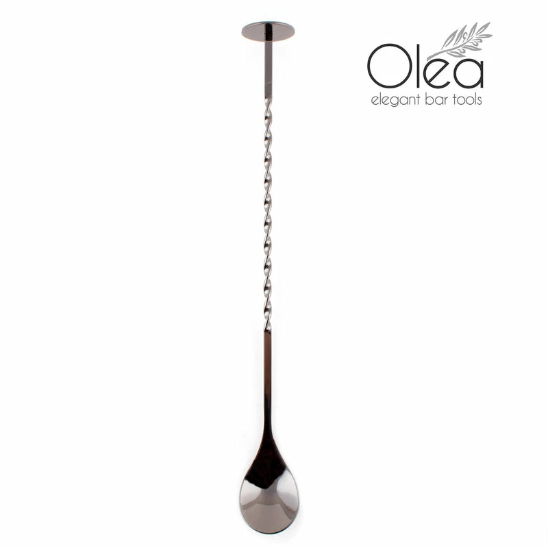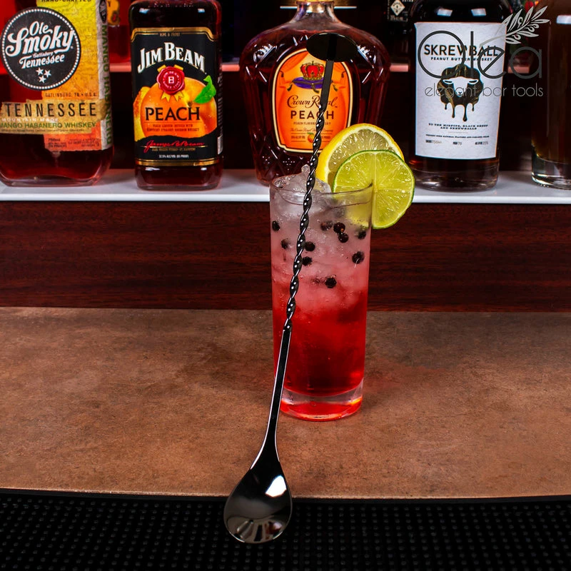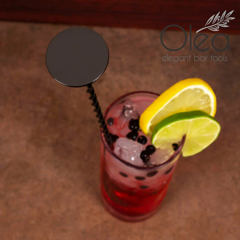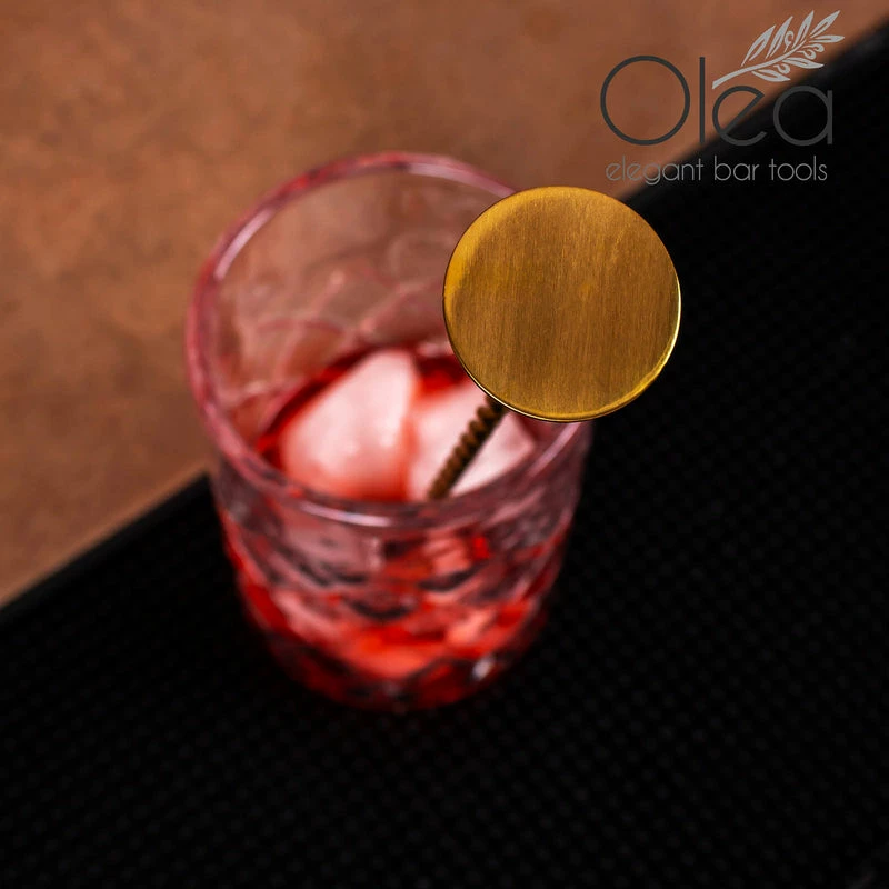 This bar spoon offers the professional bartender a variety of desirable features. The beautiful metallic finish showcases an elegant, trendy style to your crafting. The twisted stem of the spoon should allow for a more fluid motion, both through the mixing vessel and your fingers, allowing for ease in the stirring action. The flat disk plate at the end of the spoon not only adds a weight for more control, but it can also act as a muddler.
