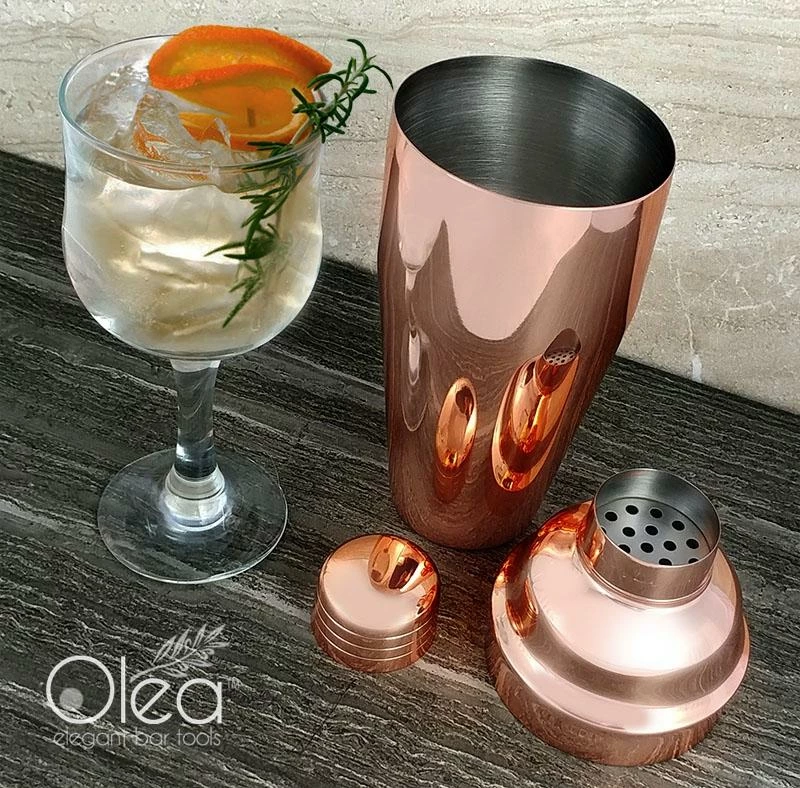 Absolutely exquisite are the perfect words to describe this stunning Copper Plated cobbler style cocktail shaker. One of the first editions to our line of Olea™ Elegant Bar Tools, this 3 piece shaker is every master mixologists and professional bartenders dream bar tool. This high quality piece is constructed from a durable stainless steel material and then beautifully plated with a reflective Copper finish.