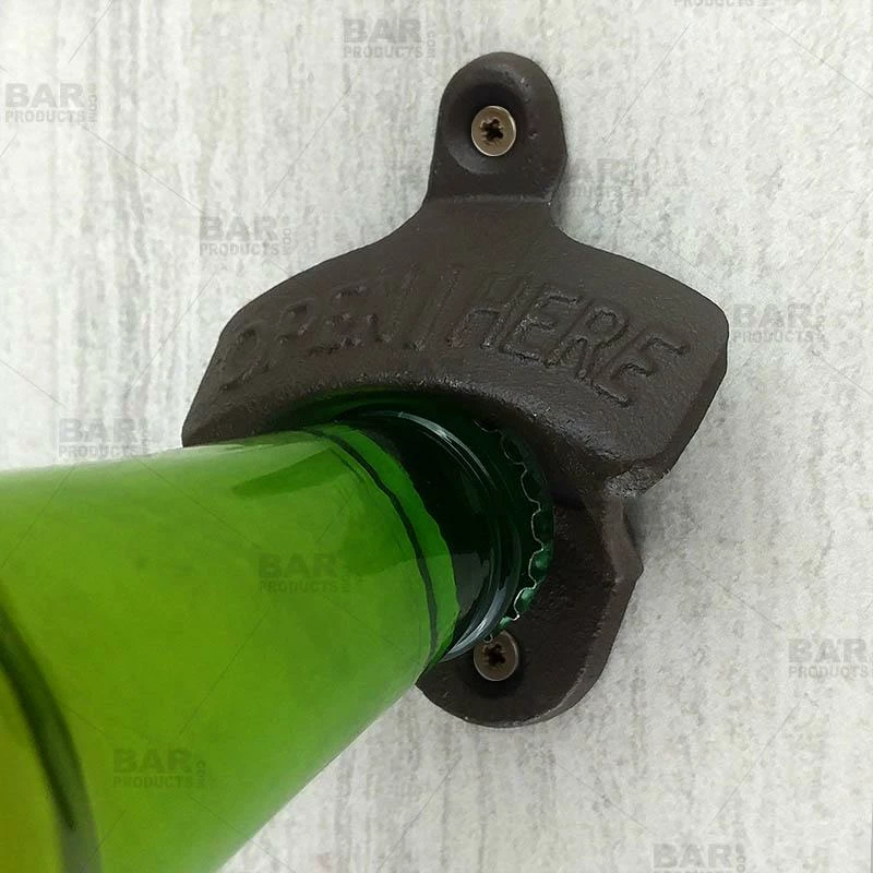 This extremely durable cast iron wall mounted opener showcases an “open here” message. It easily and securely mounts to your wall or wood plaque with 2 screw holes on the top and bottom, offering you and your guests a unique way to open your beer bottles.