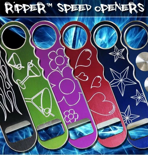 Ripper™ bottle openers are lighter then other stainless speed openers, with the Cut Out Ripper™ Opener being the lightest in the market but still strong enough to open a countless number of bottles. Stylish, rugged, and lightweight, these Ripper™ bottle openers are fully cnc machined from 6061 t6 aircraft billet aluminum, then anodized and re-machined to add the silver accents. A stainless insert is then installed for added strength. Designs are laser engraved on both sides of opener. Works on all bottles.