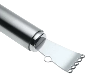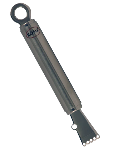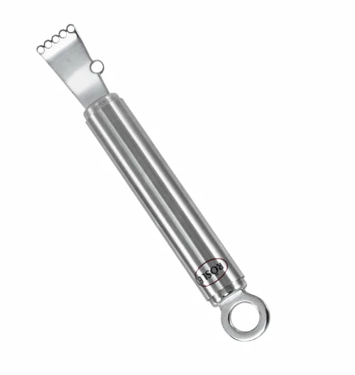 This Rosle name brand Zester is sturdy, balanced and fits comfortably in hand. It measures 6.3 inches and smoothly remove fine strips of peel from citrus. This Zester is dishwasher safe and is made of 8/10 stainless steel with a satin finish handle.