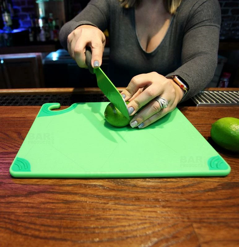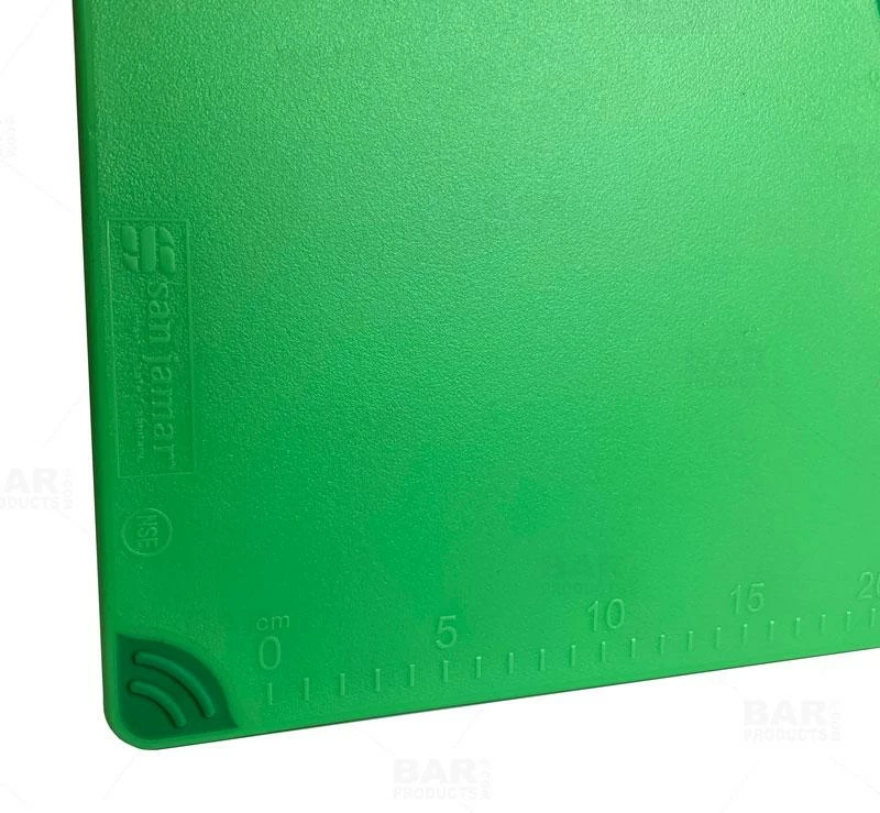 The Saf-T-Gripยฎ X-Pediterโข Cutting Board from San Jamarยฎ will certainly be a great addition to any bar or kitchen for all of your cutting needs. It measures 9″ x 12″ x 3/8″, and features anti-slip grip corners, a food safety hook, and even an integrated ruler. It is also dishwasher safe.