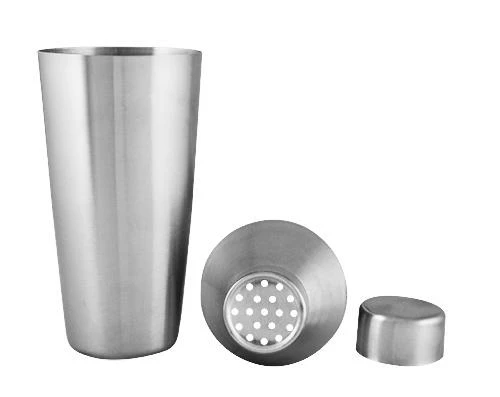 This unique 3 piece shaker is contructed of brushed stainless steel. It features a 28oz shaker tin with an elongated middle section (strainer) which fits snug inside the tin rather than outside allowing for less spillage. This Tapered Metal Shaker is not only elegant looking but it also is an ideal alternative to the standard 3 piece shaker