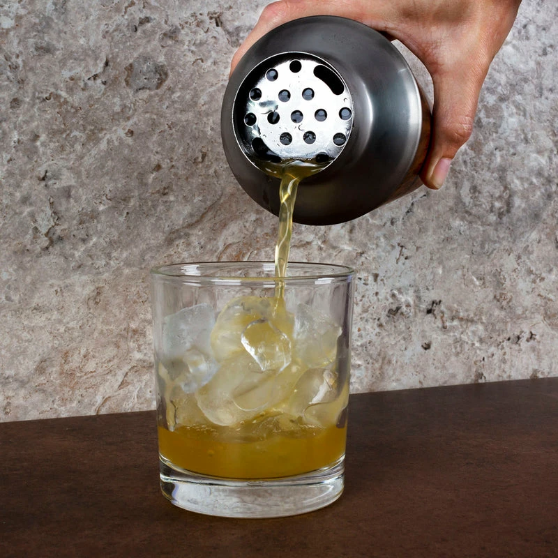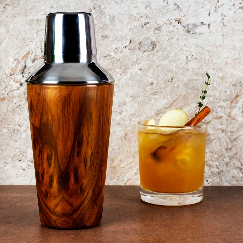 This Stainless steel shaker has an elegant warm-colored wooden outside that is sure to stand out in any type of bar setting. It measures 8.5″ tall with a rim diameter of 3.5″ and holds up to 20 ounces of liquid. This shaker has a tight-fitting cap and a built-in strainer that allows you to shake and pour effortlessly without making a mess.