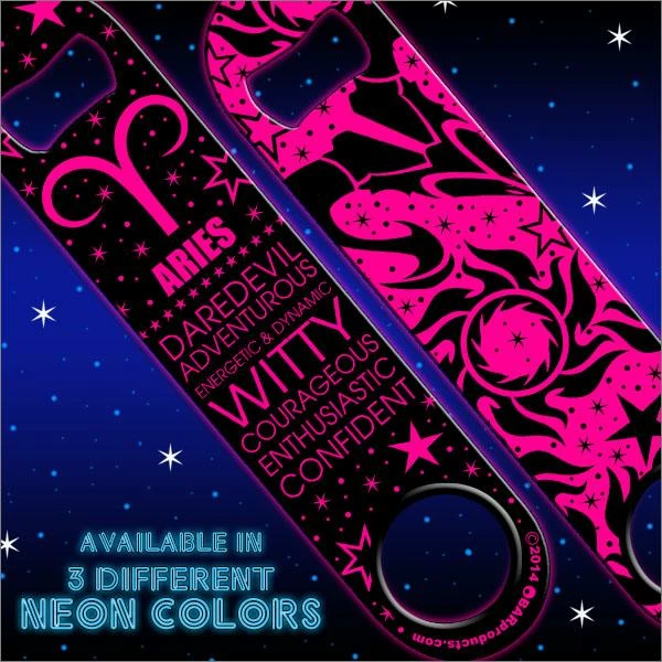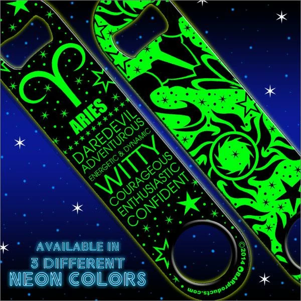 Whatโs your sign and what does it say about you? We have created a line of NEON Zodiac Sign Speed Bottle Openers you are sure to love. Each of the 12 designs are available on 3 different colored neon openersโฆ Green, Yellow and Pink. They feature all symbols relevant to your astrological birth sign, as well as your characteristics. These bottle openers glow vibrantly under black lighting for the added โspace-likeโ effect.