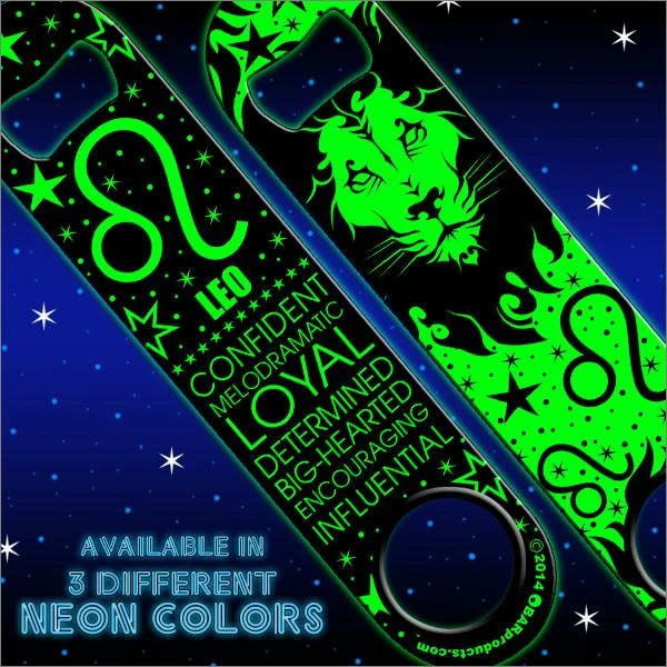 What’s your sign and what does it say about you? We have created a line of NEON Zodiac Sign Speed Bottle Openers you are sure to love. Each of the 12 designs are available on 3 different colored neon openers… Green, Yellow and Pink. They feature all symbols relevant to your astrological birth sign, as well as your characteristics. These bottle openers glow vibrantly under black lighting for the added “space-like” effect.